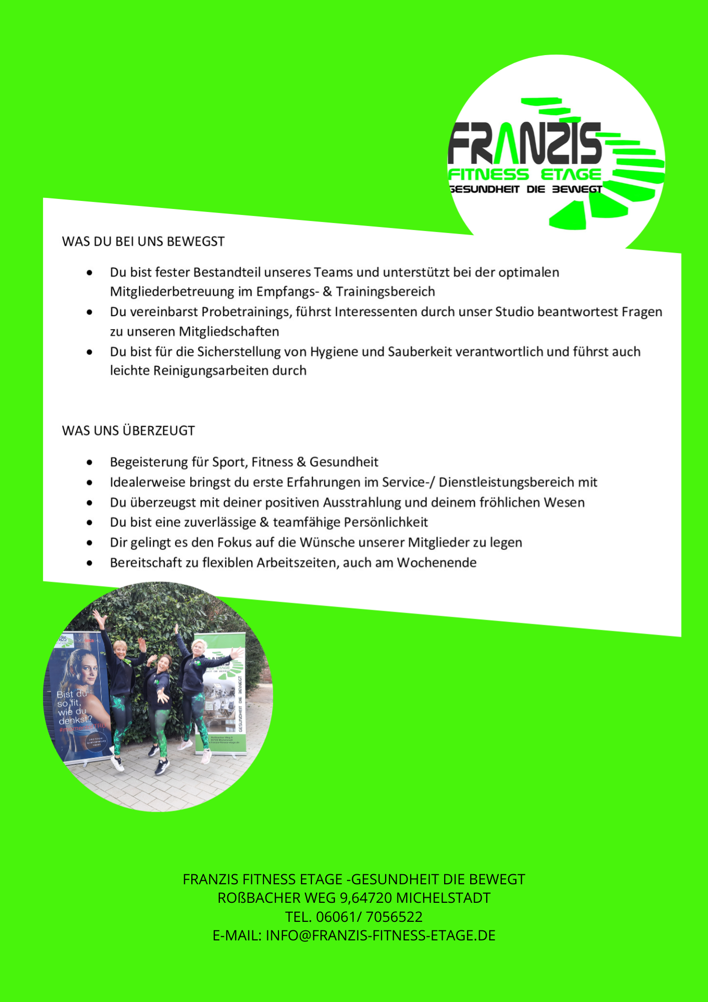 - Zusatzqualifikationen (z.B. Trainer B-Lizenz, Group-Fitness Trainer, Pilatestrainer, etc.) von Vorteil